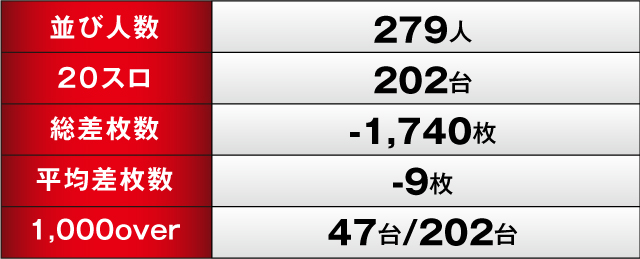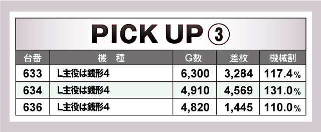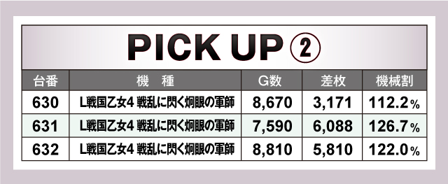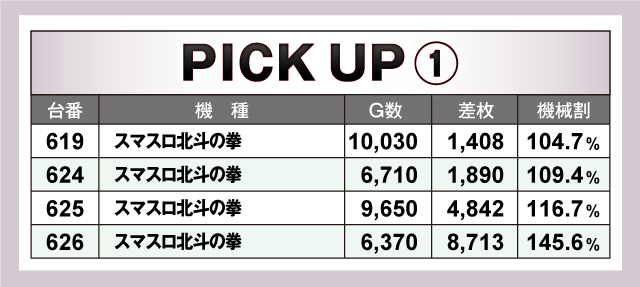 続いては、とくに好調だった3機種3箇所について。まず「スマスロ北斗の拳」は、ピックアップ4台の平均差枚は+4,213枚と上々の結果をマーク。また「L戦国乙女4 戦乱に閃く炯眼の軍師」「L主役は銭形4」の2機種は、どちらも+3,000枚を超える好結果が多数出現しており、とくに「L戦国乙女4 戦乱に閃く炯眼の軍師」は3台平均+5,023枚と素晴らしい結果を残していた。また、これらの良台のほとんどは並びで出現していたので、今後の立ち回りの参考にしてもらえたら幸いだ!