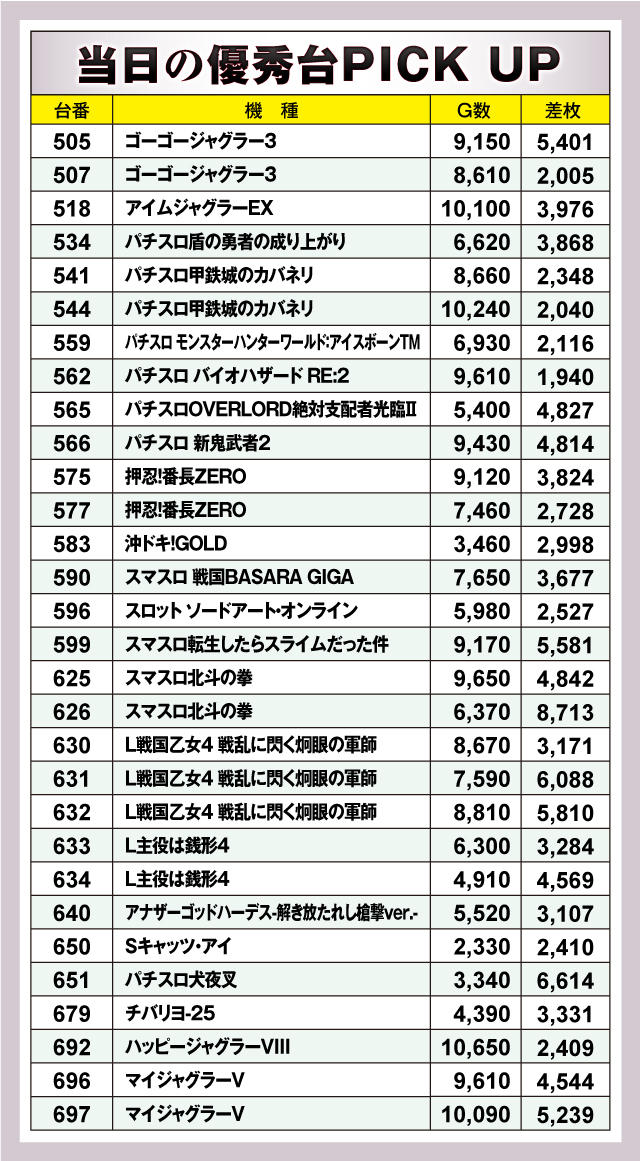 まずは優秀30台ピックアップの紹介から。30台のうち29台が+2,000枚を超えており、+3,000枚オーバーは20/30台。そして+5,000枚オーバーは7/30台出現していた。最優秀台は626番台の「スマスロ北斗の拳」で、差枚は+8,713枚という結果となった。ランキングを見渡すと、スマスロが大部分を占めるなかジャグラーシリーズが7台ランクインしていることから、ハイスペック機種からノーマルタイプまで幅広い機種に楽しめる環境が用意されていたようだ!