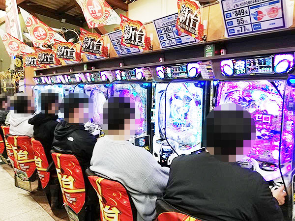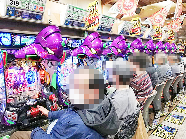 16時ごろの4円パチンコを見てみると「e Re:ゼロから始める異世界生活 season2」や「新世紀エヴァンゲリオン〜未来への咆哮〜」が高稼働。プレイヤーの嬉しそうな表情を多数確認している。