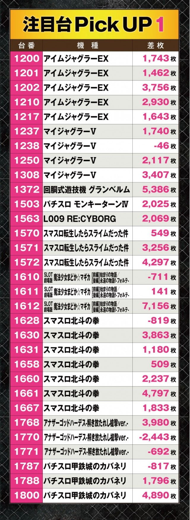 なかでも『スマスロ転生したらスライムだった件』の盛り上がりが大きく、平均+2,701枚と素晴らしい結果を残している。さらに『スマスロ北斗の拳』や『アイムジャグラーEX』の並びも平均+2,000枚を超えるなど、多くの好調台が機種性能をフルに発揮できていたようだ。