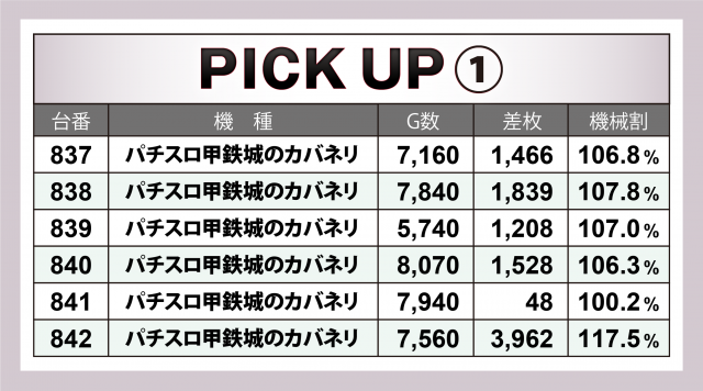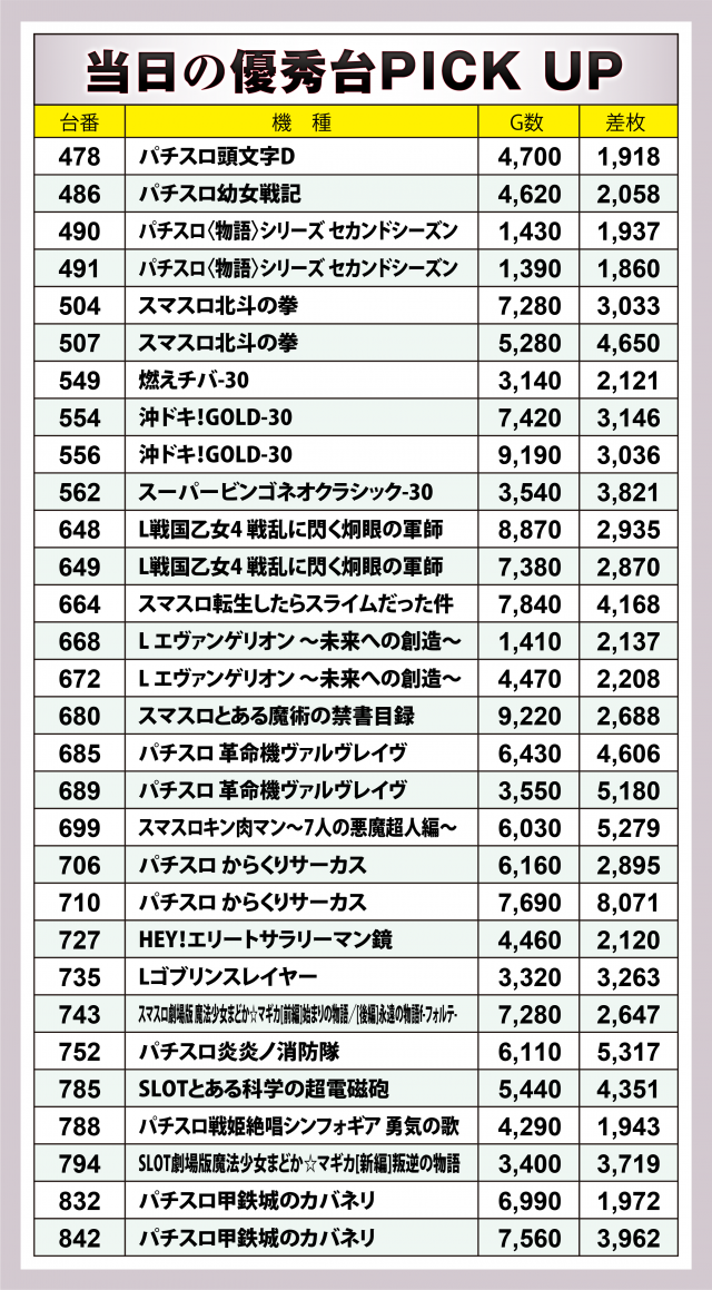 最初は優秀30台のPICK UPからチェック。30台のうち全体の8割超となる25台が差枚数+2千枚以上を達成、+3千枚以上は全体の半数となる15台、+4千枚オーバーは8台、+5千枚オーバーは4台となった。