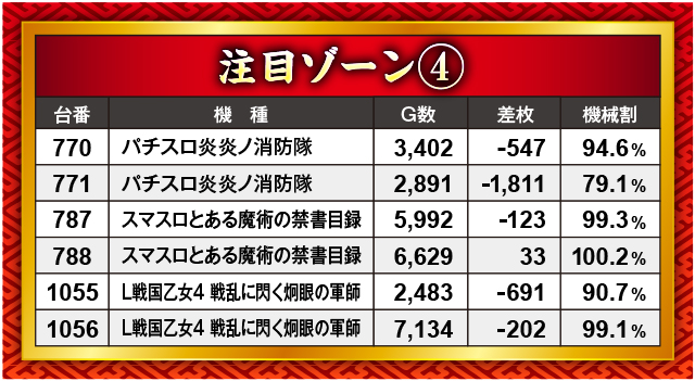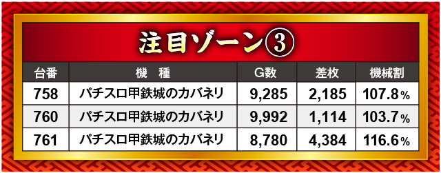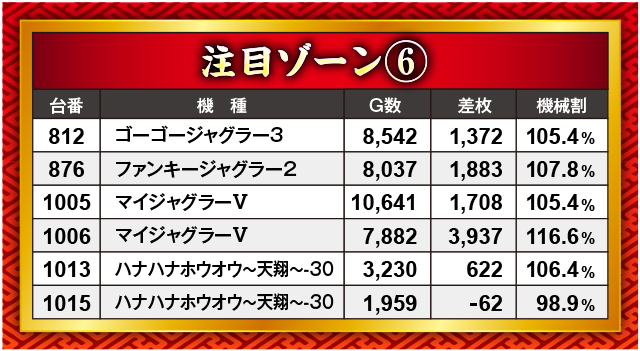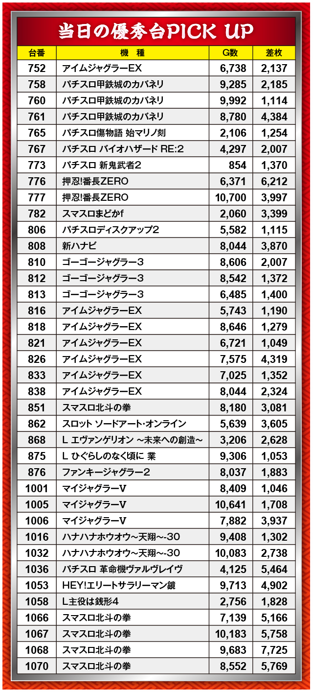 今回パチスロコーナーで優秀な結果を残し、注目を浴びていた機種は以下の通り。その台番に注目してみると、前回と同じく2台並び・3台並びでプラっているのが分かる。また『ジャグラー』シリーズも多く含まれており、さまざまな機種にチャンスがあったのは疑う余地もないだろう。