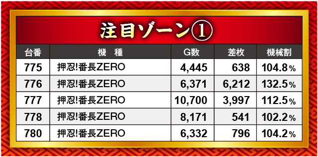 『押忍!番長ZERO』に5台並びでプラス差枚を叩き出したゾーンを発見!特に776・777番台が上り調子だったようだ。