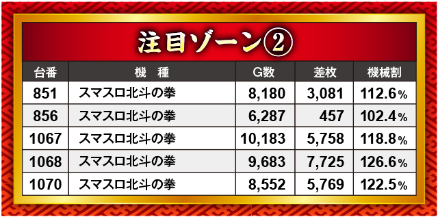 『スマスロ北斗の拳』からは、2台並びと3台並びが出現。5台中4台が機械割110%を上回っており、1068・1070番台に至っては120%超えの快挙を達成した。