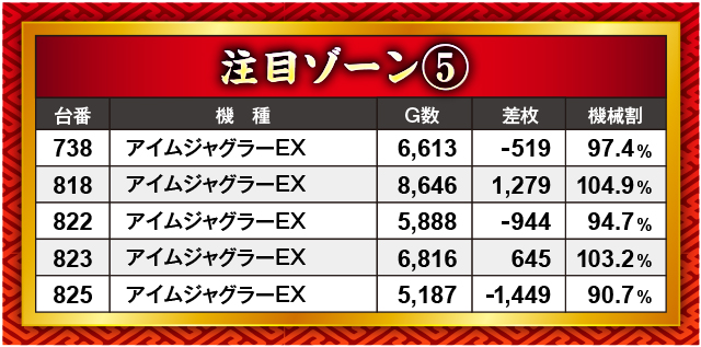 トータルランキングに多くランクインしていた『アイムジャグラーEX』だが、こちらの5台は今ひとつな結果に…。