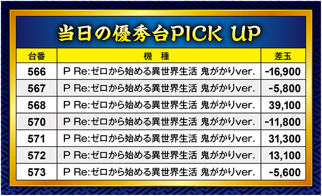 今回ぱちタウン取材班が注目したのは、『P Re:ゼロから始める異世界生活 鬼がかりver.』コーナー。勝率こそ42.9%となっているが、30,000玉オーバー記録が2台生まれたおかげで総差玉+43,400玉・平均+6,200玉をマークするに至った。