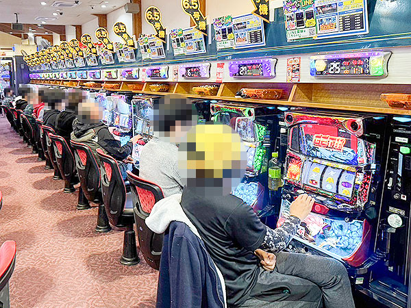 500円/94枚パチスロの支持も厚い。プレイヤーたちが楽しそうにレバーを叩く姿を目撃している。