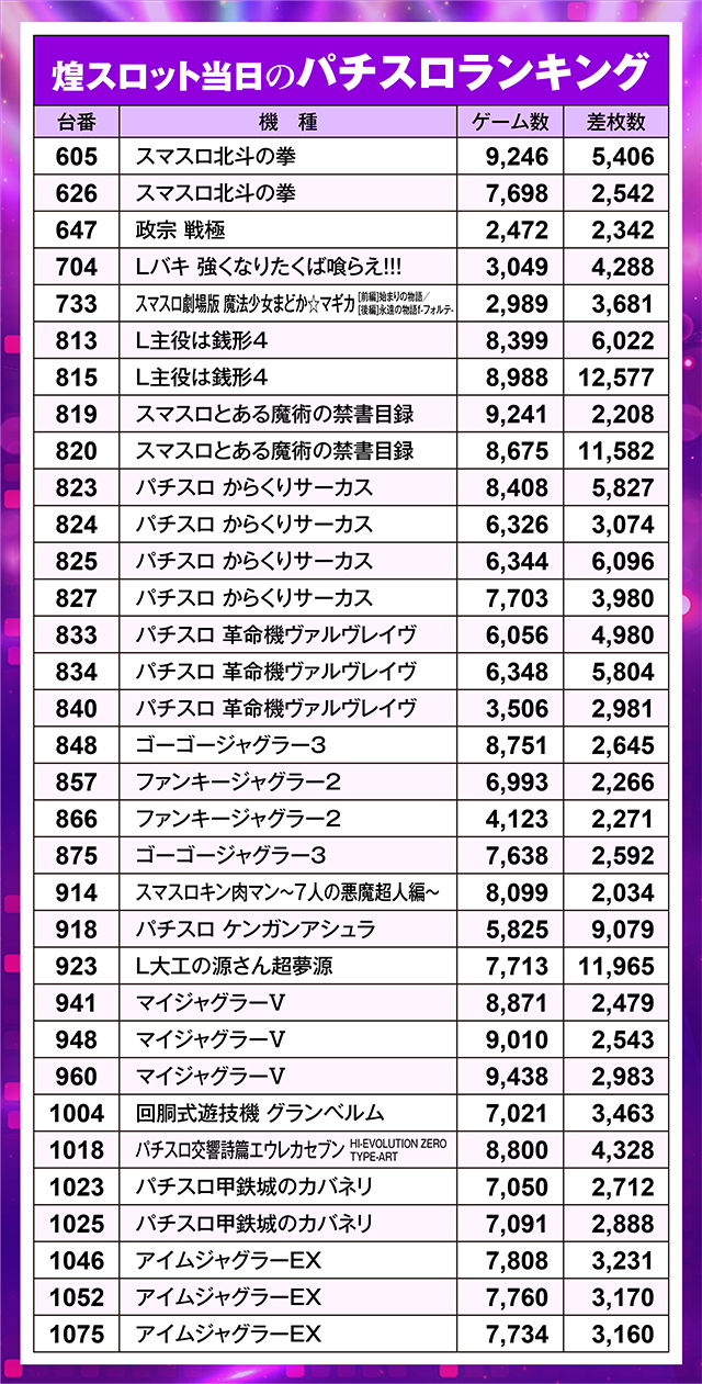 好結果を残した台は、「L主役は銭形4」や「スマスロ北斗の拳」などでも確認。