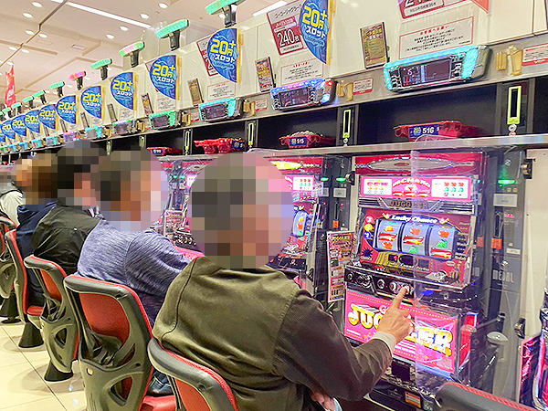 全体的に稼働の高い500円/89枚パチスロでは、真剣な表情でレバーを叩くプレイヤーの姿を数多く目撃している。