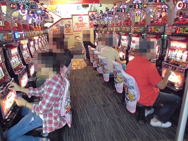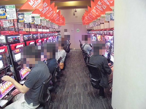 機種構成がバラエティに富んだ5円パチスロでも、プレイヤーの楽しそうな様子がうかがえた。