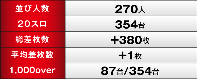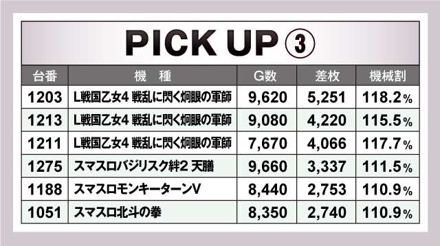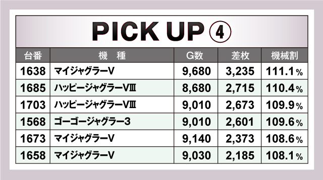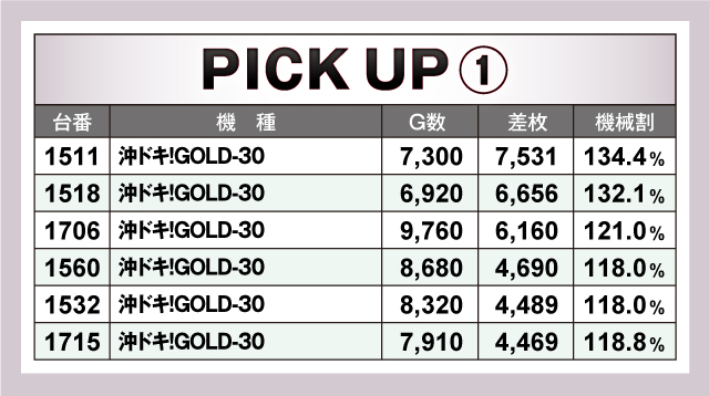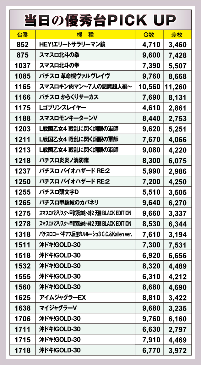 続いては当日とくに活躍していた注目箇所をチェック。上で紹介した「沖ドキ!GOLD-30」は好記録がアチコチに出現しており、ピックアップ6台の平均差枚は+5,666枚の圧巻の結果! またスマスロも12台平均+5,809枚と超絶結果をマーク! さらにジャグラーシリーズの6台ピックアップは+2,630枚とこちらも好調だった!