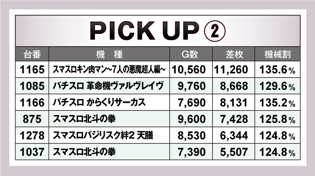 まずは優秀台30台ピックアップの紹介から。30台すべてが+2,000枚オーバーで、+3,000枚オーバーは26台出現。そして+5,000枚オーバーは12台で、最優秀台は、1165番台の「スマスロキン肉マン~7人の悪魔超人編~」で差枚+11,260枚をマーク! 全体的にスマスロを筆頭に、「パチスロ バイオハザード RE:2」「沖ドキ!GOLD-30」などの6.5号機やジャグラーシリーズが複数ランクイン。とくに「沖ドキ!GOLD-30」は、9/30台がランクインしていたことからも、同機種のベースの高さが窺えた!