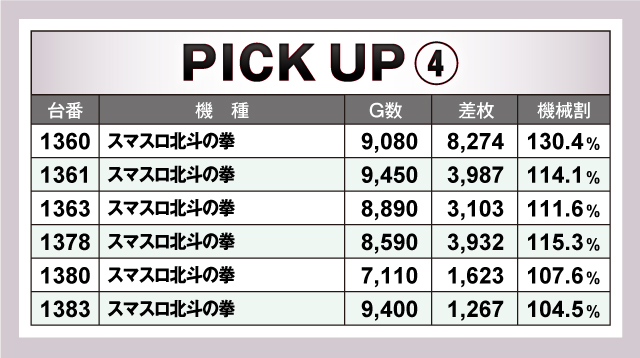 続いては、当日の好調台3機種をピックアップ。3機種全てが平均+2,000枚オーバーで、とくに「沖ドキ!GOLD-30」のピックアップ12台の平均差枚は、+3,788枚と絶好調! また「スマスロ北斗の拳」も優秀で、平均8,753Gの平均差枚+3,698枚とこちらも圧倒的な結果を残していた!