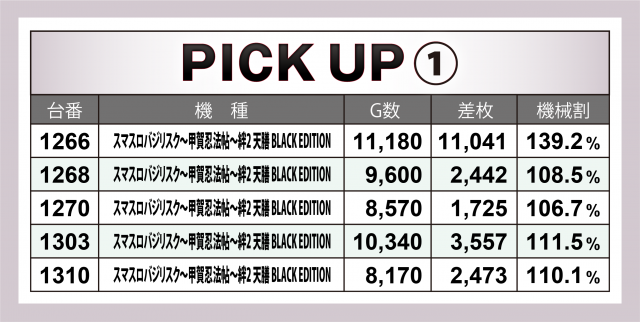 この前日に導入された『スマスロバジリスク~甲賀忍法帖~絆2 天膳 BLACK EDITION』は早くも+1万1千枚突破を成就。5台の合計で+2万1千枚オーバーに達した。