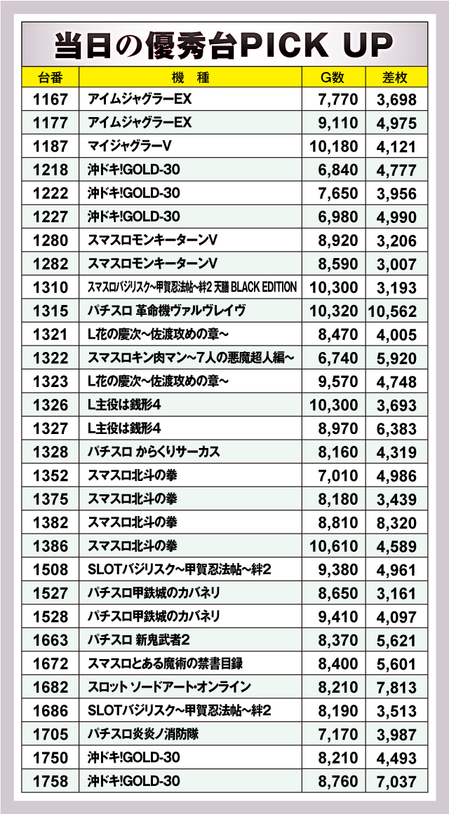 まずは優秀台30台ピックアップを見ていこう。30台すべてが+3,000枚オーバーで、+5,000枚オーバーは8台出現! そして最優秀台は、1315番台の「パチスロ 革命機ヴァルヴレイヴ」で、差枚+10,562枚という結果となった。全体的にスマスロの活躍が目立ち、またジャグラーシリーズも多数ランクイン。店内のアチコチに楽しめる環境が用意されていたようだ!