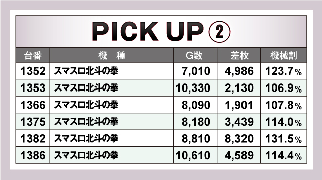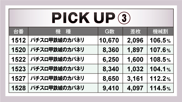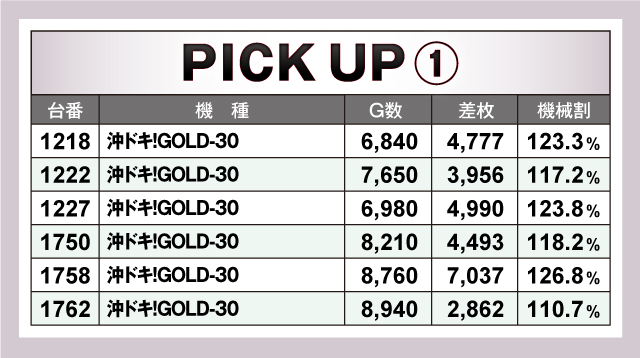 続いては当日とくに活躍していた3機種を紹介。それぞれ6台ずつのピックアップの平均差枚は「沖ドキ!GOLD-30」は+4,686枚、「スマスロ北斗の拳」は+4,228枚、「パチスロ甲鉄城のカバネリ」は+2,314枚と優秀で、どれもがほぼぶん回し状態。全体的に各機種にチャンスが散りばめられていたが、とくにこの3機種は機種単位でチカラを入れていたようだ!