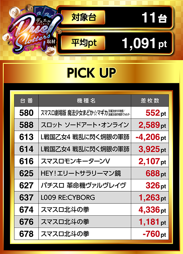 588番台の「スロット ソードアート・オンライン」と616番台の「スマスロモンキーターンV」も2,000ptを超えた。