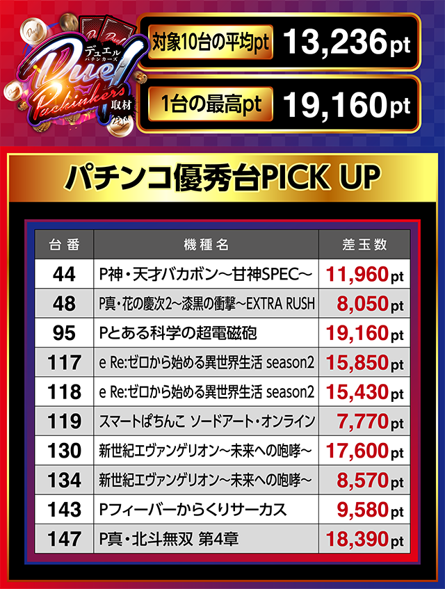 95番台の「Pとある科学の超電磁砲」は19,000ptを上回り、147番台の「P真・北斗無双 第4章」は18,000ptを超えた。