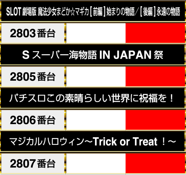 閉店時には2803番台の『SLOT劇場版 魔法少女まどか☆マギカ[前編]始まりの物語/[後編]永遠の物語』から2807番台の『マジカルハロウィン〜Trick or Treat!〜』までが連なってプラスpt!