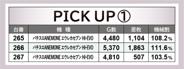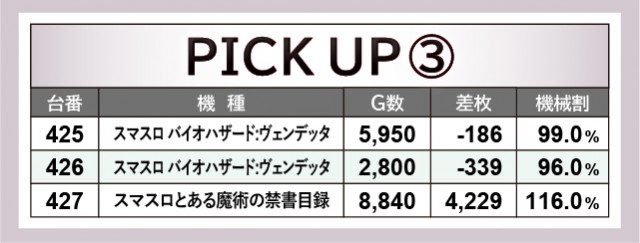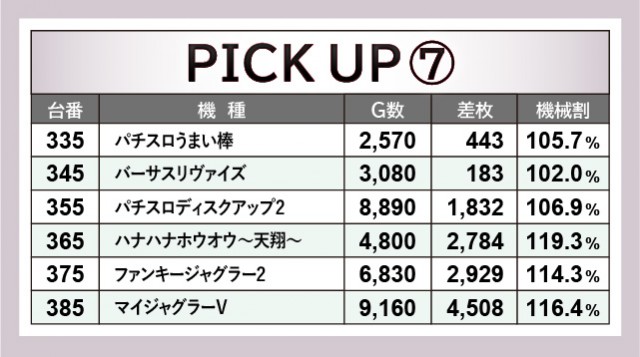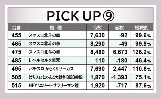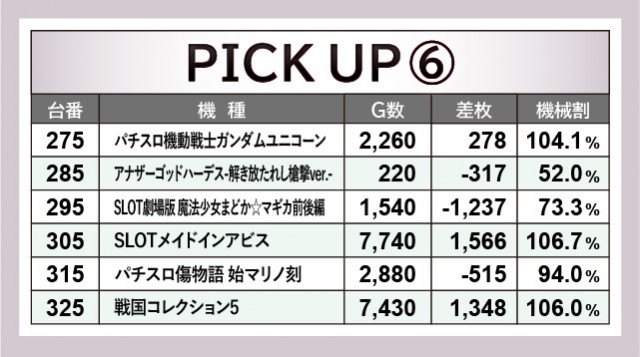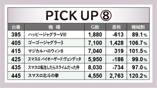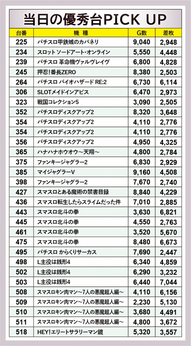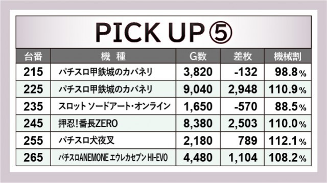 当日は末尾⑤番台が活躍しており、その事実にいち早く気づいたファンはどれほどいただろうか。『パチスロ甲鉄城のカバネリ』225番台は9千回転台をマークし、さらに差枚数+2,948枚と、その事実を如実に物語っている。『押忍!番長ZERO』245番台・『SLOTメイドインアビス』305番台も同様で、遊技していたファンは自然とレバーオンに力が入ったはずだ。