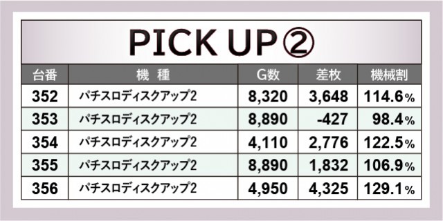 機種ごとに活躍していた様子が印象的で、『パチスロディスクアップ2』は全5台中4台がプラス差枚を達成している。352番台+3,648枚・356番台+4,325枚と好記録を残しており、右肩上がりに伸びる出玉を見てファンは満足していたはずだ。また『スマスロとある魔術の禁書目録』427番台+4,229枚、『L主役は銭形4』503番台+7,044枚という熱量の高さもあり、有意義な時間を過ごせたエリアとなった。