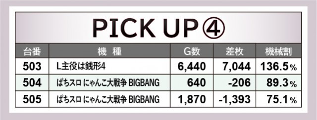 当日は多くの大台突破台が生まれており、店内は凄まじい熱気に満ちていた。その中で『L主役は銭形4』503番台+7,044枚と大きな記録を打ち立てており、他にも『スマスロ北斗の拳』443番台+6,821枚といった数字も見られる。またノーマル機の名前が名を連ねており、あらゆる機種にチャンスが眠っていたと想像できる内容だ。