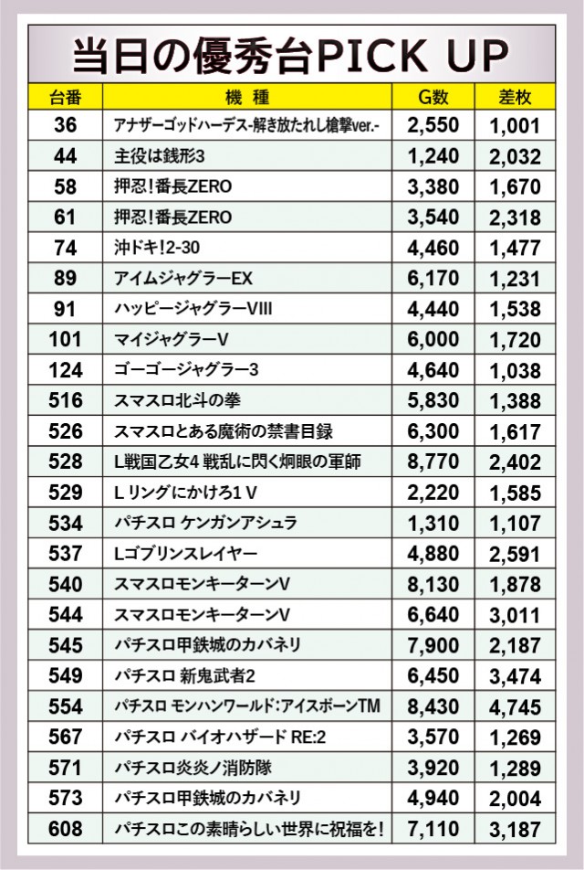 ピックアップされた優秀台を見れば分かるように、幅広い機種が名を連ねている。その中で『L戦国乙女4 戦乱に閃く炯眼の軍師』528番台8,770G+2,402枚という高パフォーマンスを確認でき、『パチスロ モンスターハンターワールド:アイスボーンTM』554番台8,430G+4,745枚という秀逸な記録も発生。全体的に回転数と差枚数が比例する展開が目立っていたことから、ファンは有意義な時間を過ごせたことだろう。