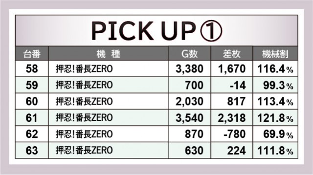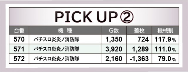今なお現役で稼働する『押忍!番長ZERO』は、58~63番台にポテンシャルが秘められていた。61番台+2,318枚という熱気から、ファンはレバーを叩く力が強くなっていったことだろう。また『パチスロ炎炎ノ消防隊』も571番台+1,289枚と気を吐き、こちらも全3台が可能性を感じられる状況となっていた。