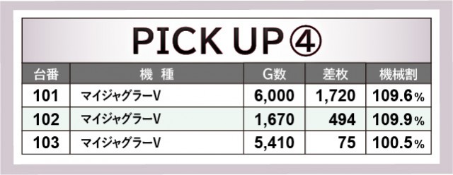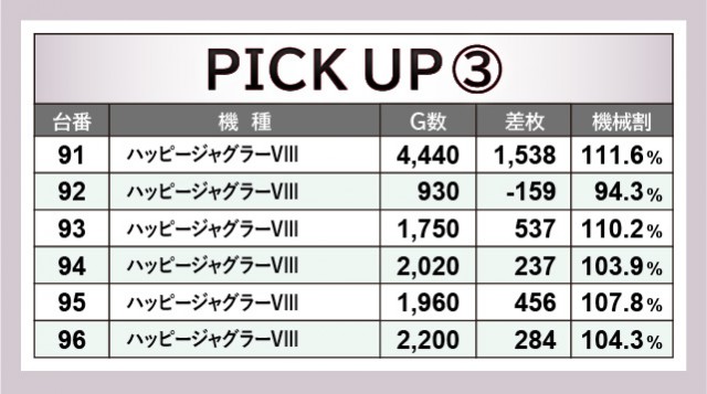 『ジャグラー』シリーズからは『ハッピージャグラーVⅢ』『マイジャグラーⅤ』が注目の存在となっていた。前者は全6台中5台がプラス差枚を達成しており、後者も101~103番台が全台プラス差枚を記録。回転数が大人しい点は否めないが、それでも回転数と差枚数が比例する展開を見せており、同機種の安定感がハッキリと分かる内容になっていた。
