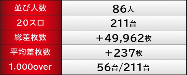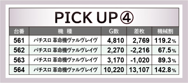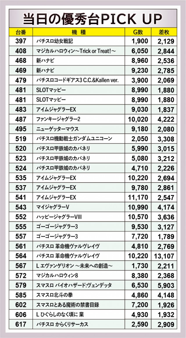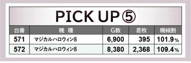 万枚OVERという偉大な記録を打ち立てた『パチスロ 革命機ヴァルヴレイヴ』。全4台にポテンシャルが秘められていたが、半分がプラス差枚という結果に終わってしまった。より回転数が増えれば、もっと結果が大きく変わっていたかもしれない。そしてしてもない『マジカルハロウィン8』は全台プラス差枚を達成。突出した熱量ではないが、それで572番台+2,368枚のように安定感のあるパフォーマンスを披露していた。