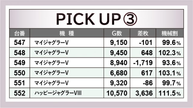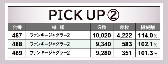『ジャグラー』シリーズは回転数をチェックすれば一目瞭然で、多くの台で手応えを感じられる状況となっていた。万回転OVER台が発生している状況は喜ばしく、しかもそればかりか『ファンキージャグラー2』487番台+4,222枚や『ハッピージャグラーVⅢ』552番台+3,636枚といった熱気が発生。右肩上がりに伸びる出玉を見て、ファンは恍惚の表情を浮かべていたはずだ。