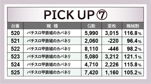 『マジカルハロウィン〜Trick or Treat!〜』も同様に2台中2台がプラス差枚を達成。408番台+2,844枚と、こちらの安定感のある内容でファンを魅了していた。また人気機種『パチスロ鋼鉄城のカバネリ』は高い活気と熱気に包まれており、520番台+3,015枚や523番台+3,212枚といった記録が発生。ファンはレバーを強く叩き、同機種の面白さに取りつかれていたのは間違いない。