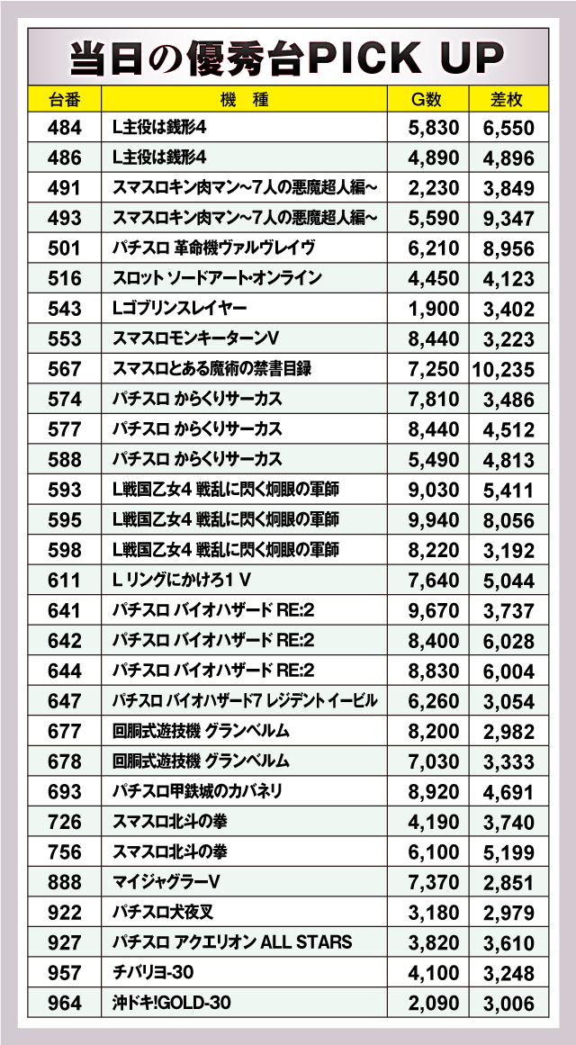 まずは優秀台30台の紹介から。30台すべてが+2,000枚オーバーで、+3,000枚オーバーは27台。また+5,000枚オーバーは10台と好記録が続出! そのなかでもっとも優秀だったのは、567番台の「スマスロとある魔術の禁書目録」で、差枚+10,235枚をマーク! ランクイン台の多くがスマスロで、その他「沖ドキ!GOLD-30」「マイジャグラーV」がランクインしていた!