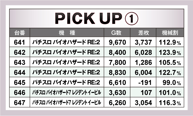 続いては、当日大活躍だった6台以上の並び8箇所を紹介。8箇所全てが平均+1,000枚を超えており、そのうち3箇所が+2,000枚オーバー! なかでも641番台〜647番台の「パチスロ バイオハザード RE:2」「パチスロ バイオハザード7 レジデント イービル」の7台並びは、6/7台がプラスの平均+2,891枚と素晴らしい結果を獲得! その他並びにも良台を多数確認できた!