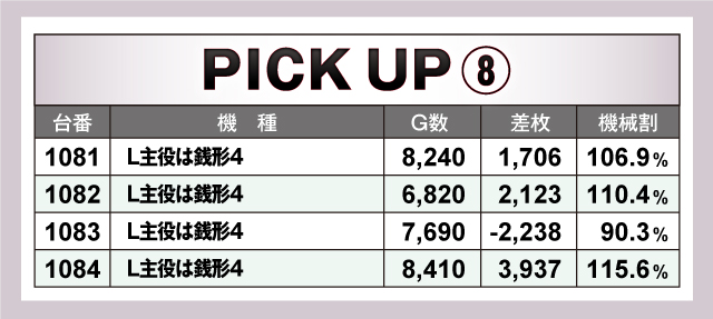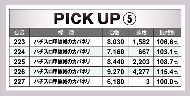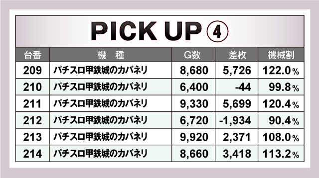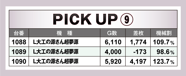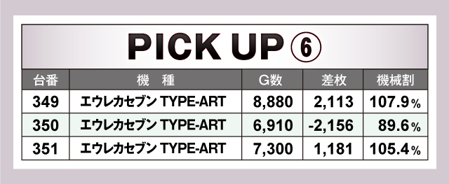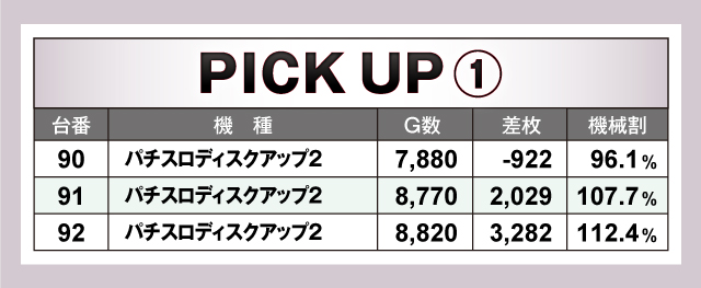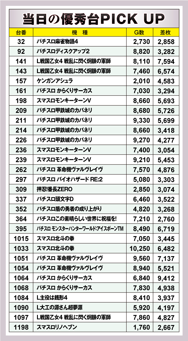 まずは当日の優秀30台PICK UPをチェック。30台すべてが+2,000枚オーバーで、+3,000枚オーバーは27台出現。そして+5,000枚オーバーは11台と好調台が多数出現していた。それらの中でもっとも優秀だったのは、1064番台の「パチスロ からくりサーカス」で、差枚+9,412枚をマーク。30台全体的にスマスロの活躍が目立っており、また「パチスロ甲鉄城のカバネリ」などの6.5号機も多数ランクイン。多くの機種にチャンスが散りばめられていたようだ!