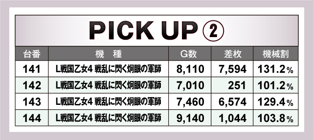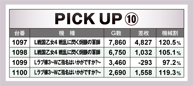 続いては並びで好調だった10箇所を紹介していこう。並び10箇所すべてがトータルプラスを達成し、そのうち9箇所が平均+1,000枚オーバー! それらのなかでもっとも優秀だったのは、141番台〜144番台の「L戦国乙女4 戦乱に閃く炯眼の軍師」の4台並びで、4台全てがプラス終了の平均差枚+3,866枚と他を圧倒する活躍ぶり。もちろんその他の並びにも優秀台を多数確認できた!
