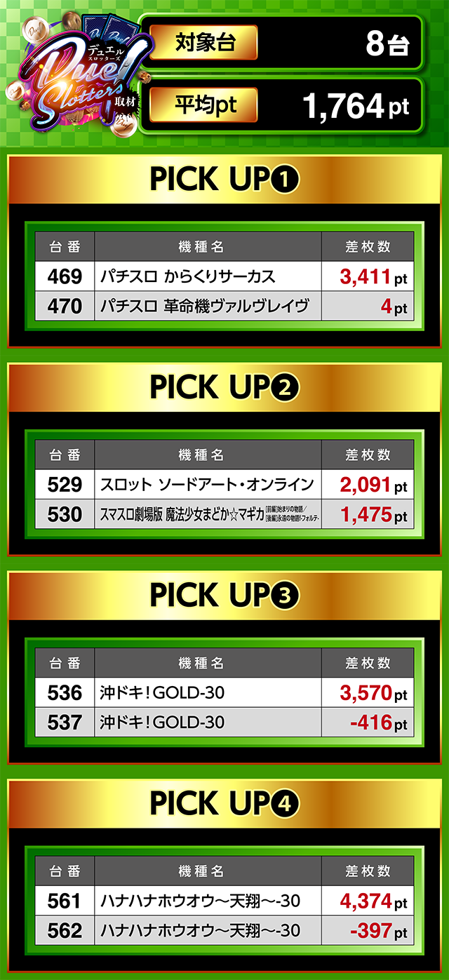 469番台と469番台にもプラスが続き、469番台の「パチスロ からくりサーカス」は3,500ptクラスであった。