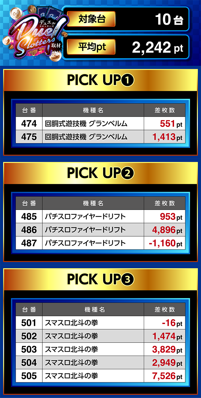「回胴式遊技機 グランベルム」は全台がプラスで、475番台は1,500ptクラス。