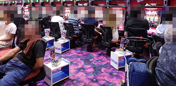 開店直後から20円パチスロは、ジャグラーシリーズや「バジリスク~甲賀忍法帖~絆」など、多数の機種が空き台も見当たらないといった状況。