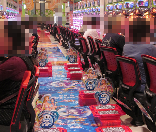 1円パチンコでもとくに海物語シリーズが注目を受けており、全体でみてもほぼ満席といった状況。
