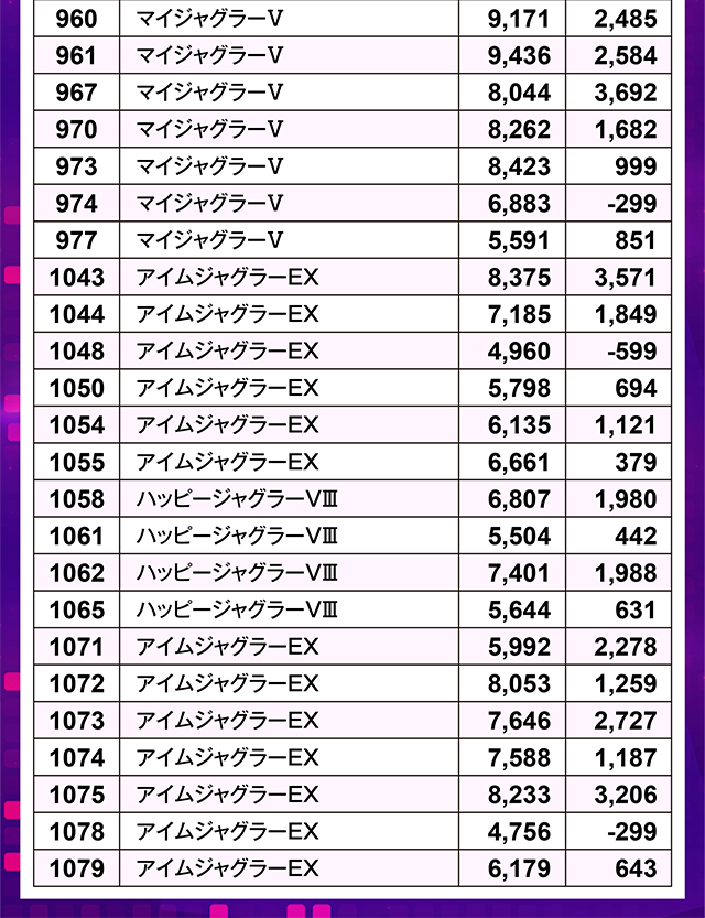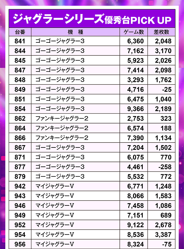 ホールには5種類のジャグラーシリーズがあり、どの機種にもキラリと輝く台アリ。