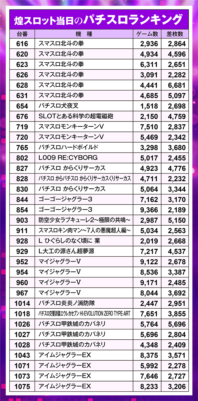 「パチスロ甲鉄城のカバネリ」にも好結果となった台があるなど、輝きを放つ台が多かった。