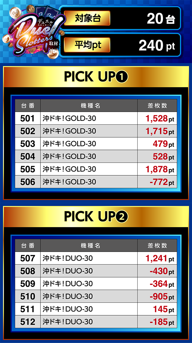 6台設置の「沖ドキ!GOLD-30」は5台がプラスとなり、3台が1,500ptオーバー。