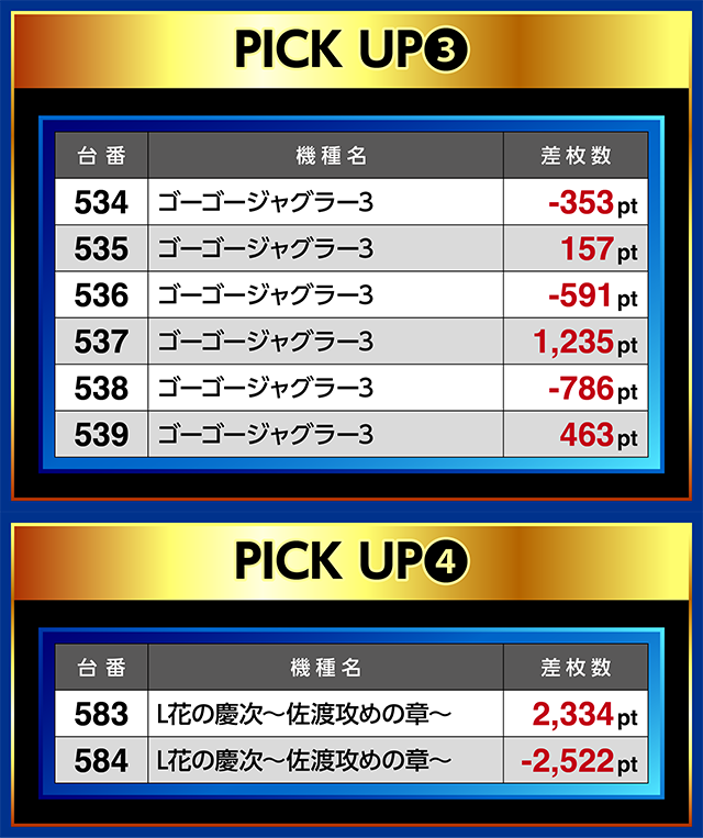 最新機種の「L花の慶次~佐渡攻めの章~」も注目の機種で、583番台は2,300ptを上回った。