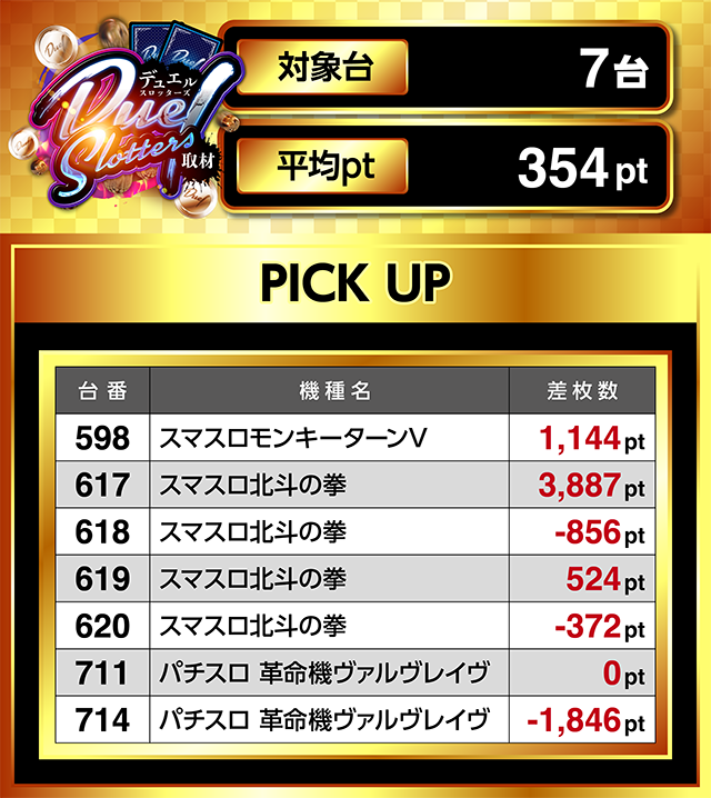 最新機種も「スマスロモンキーターンV」では、598番台が1,100ptを超えた。