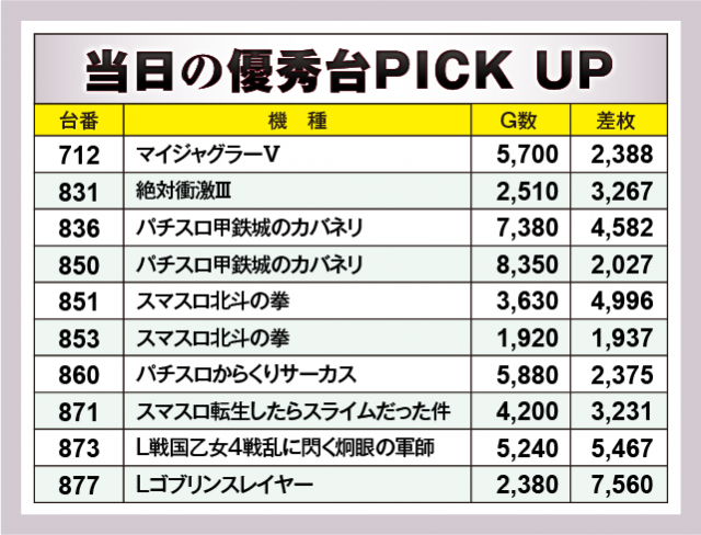 優秀台に名を連ねた10台をみてみると、スマスロ機を筆頭に活気と熱気が形成されていた。その中でも、877番台の『Lゴブリンスレイヤー』で+7,560枚をマークし、右肩上がりのグラフを描いては、恍惚の表情を浮かべていたことだろう。そのほか、後述する好調機種以外では、873番台の『L戦国乙女4戦乱に閃く炯眼の軍師』で+5,467枚、831番台の『絶対衝撃Ⅲ』で+3,267枚を記録し、ファンはレバーを叩く楽しさを感じていたに違いない。