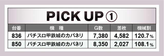 続いては、この日の好調2機種。『パチスロ甲鉄城のカバネリ』と『スマスロ北斗の拳』の人気2機種で安定した出玉を魅せており、共に2台のトータル差枚数は+6千枚オーバーを記録。じっくりと打ち込まれていたと言えるだろう。