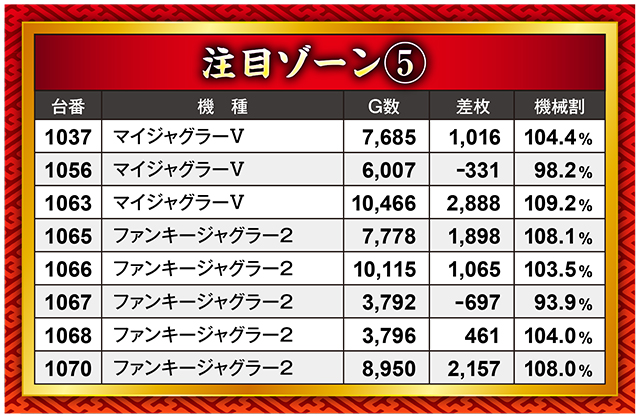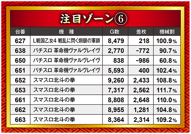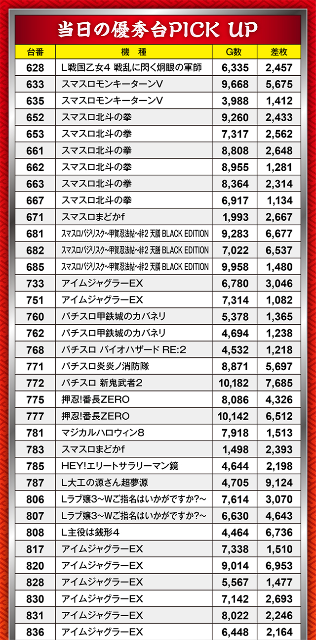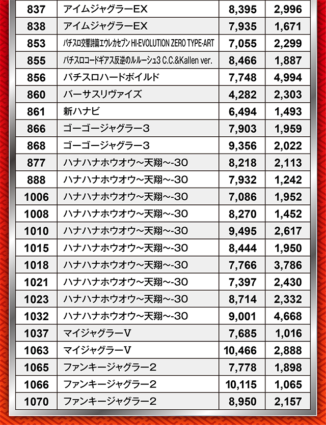 このゾーンでは特に『スマスロ北斗の拳』が好調をキープ。2,000枚オーバー台が4台と、なかなかの状況だったようだ。