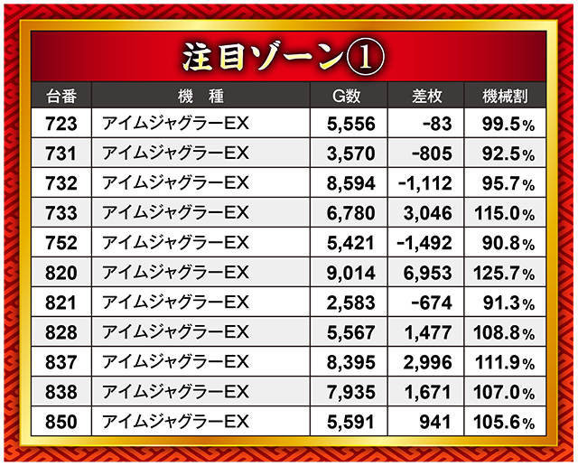 『アイムジャグラーEX』が注目ゾーンに入ってくるのはもはやお約束。今回も複数の台で優秀台挙動を確認することができた。中には820番台のように7,000枚近い結果を叩き出した台も…!