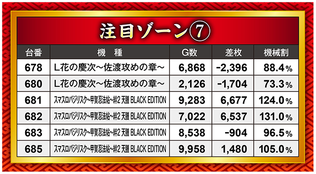 こちらのゾーンは6台並びと思しき挙動を披露。特筆すべきは真ん中2台の『スマスロバジリスク~甲賀忍法帖~絆2 天膳 BLACK EDITION』。2台揃って6,000枚オーバーの快挙!